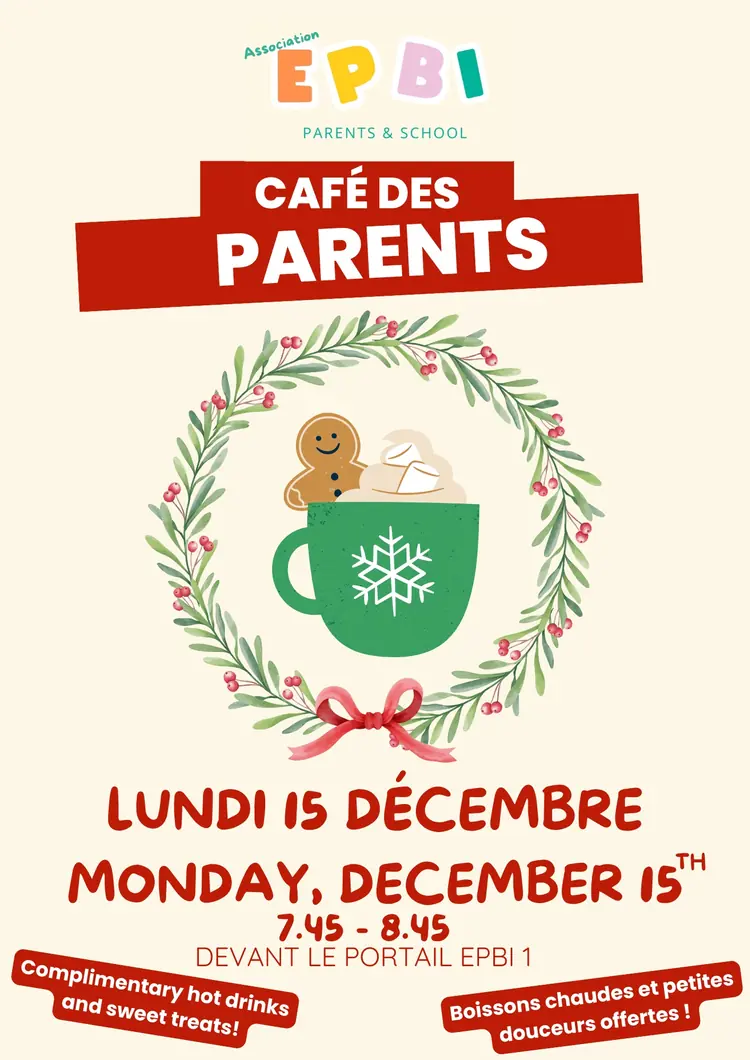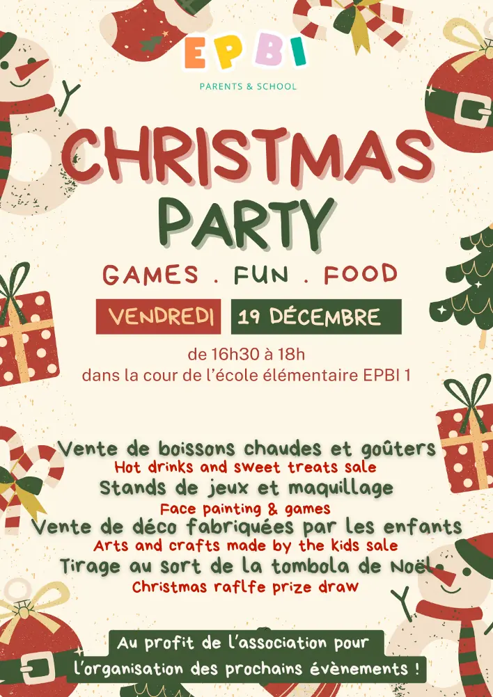 🎄 Fête de Noël de l’Association EPBI Parents & School 🎄Nous avons le plaisir de vous inviter à la fête de Noël organisée par l’ l’Association EPBI Parents & School en partenariat avec l’école, qui se tiendra le vendredi 19 décembre de 16h30 à 18h, juste après la chorale des enfants, dans la cour de